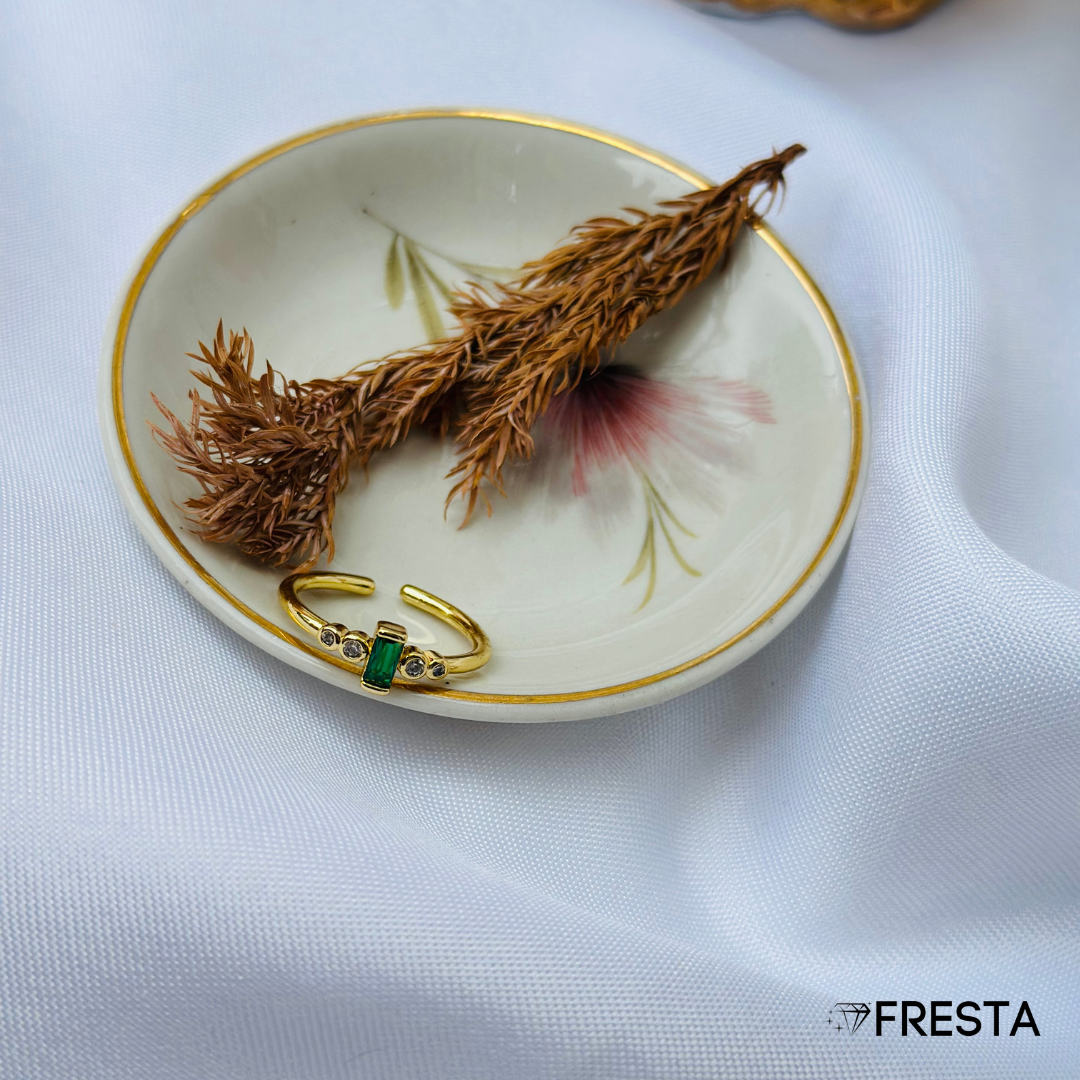💚 Piedra central tipo baguette en verde profundo. 💎 Tres circones blancos perfectamente incrustados. 💛 Acabado dorado de alta calidad, que realza cualquier tono de piel. 🔄 Diseño ajustable para un calce cómodo y personalizado.