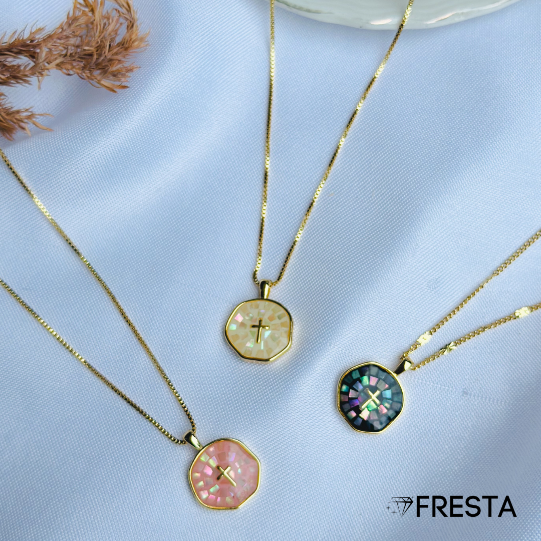 Un diseño con carácter. Su medallón irregular, con un mosaico de nácar en tonos vibrantes, refleja la luz de manera única, destacando la pequeña cruz en el centro. Un accesorio que no solo complementa tu look, sino que cuenta una historia. Disponible en negro, rosado y blanco para que elijas la versión que mejor represente tu esencia.✨