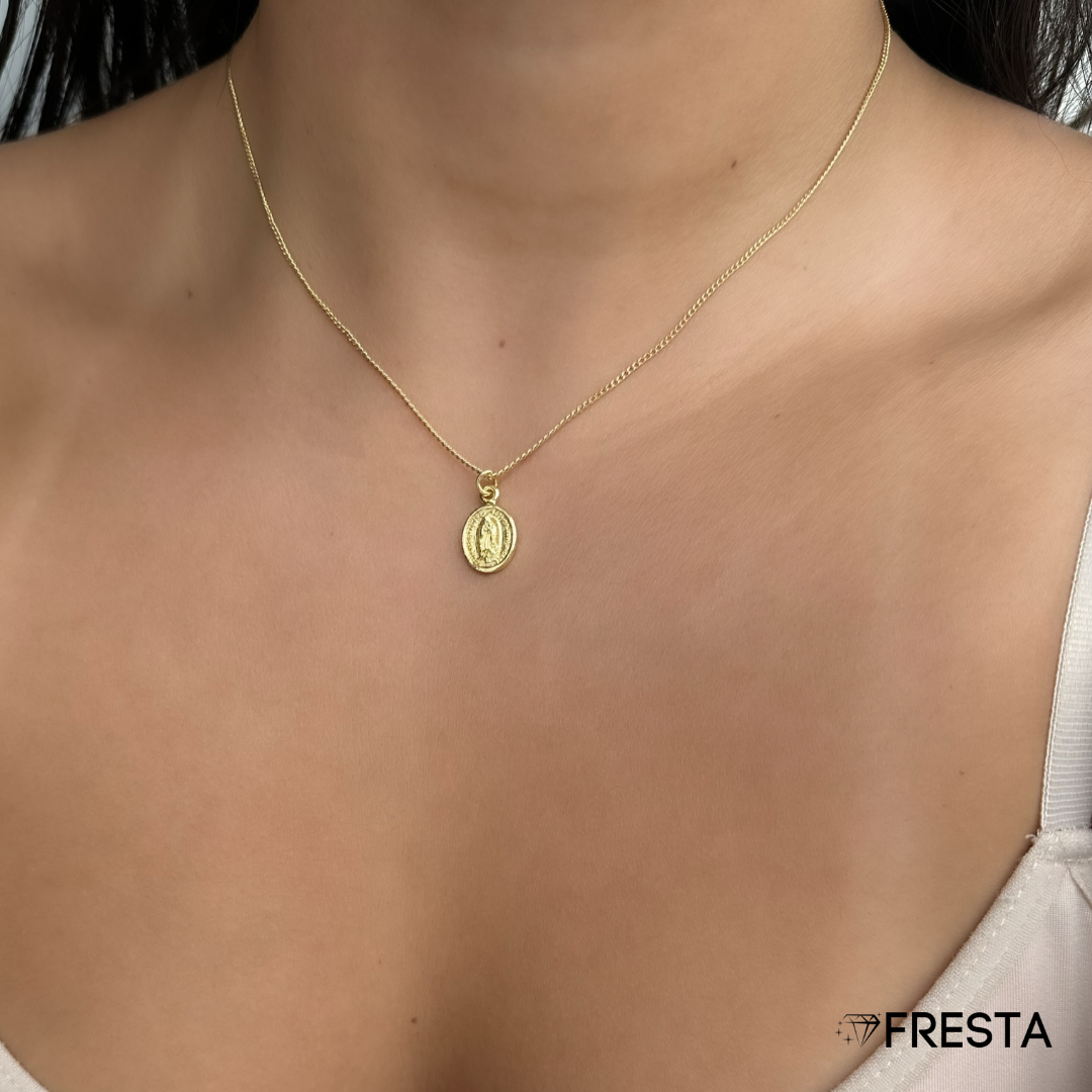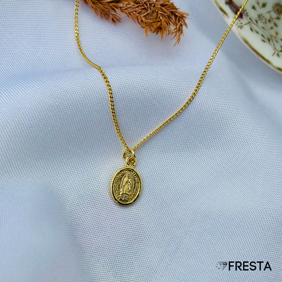 Su medalla ovalada con la imagen de la Virgen de Guadalupe simboliza protección, guía y fe. El baño en oro le aporta un brillo cálido y duradero, perfecto para quienes desean llevar siempre consigo una luz espiritual.