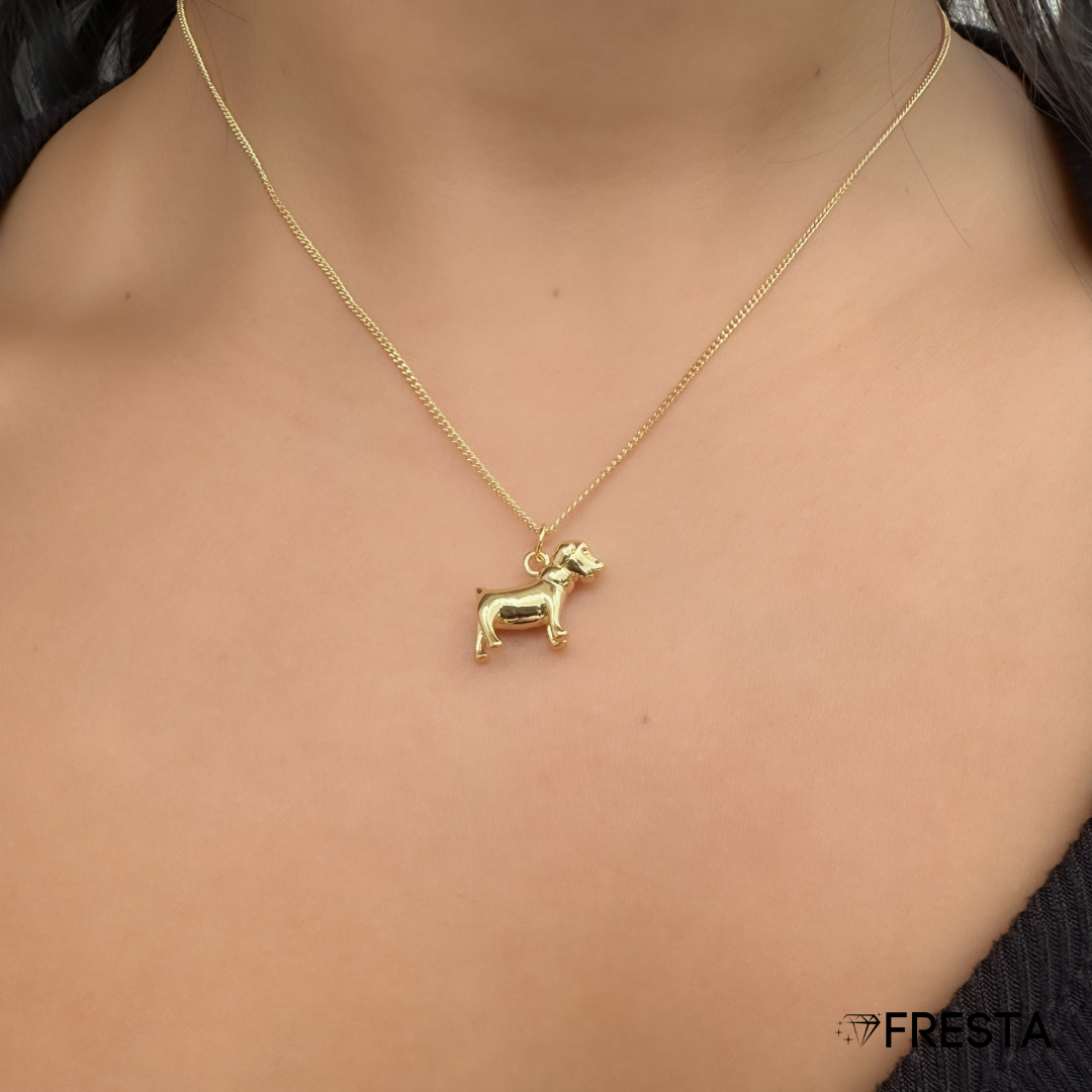 El amor perruno nunca pasa de moda. Esta cadena celebra ese lazo incondicional con un tierno dije de perrito rodinado en oro, lleno de brillo y dulzura. Perfecta para amantes de los animales y espíritus leales.