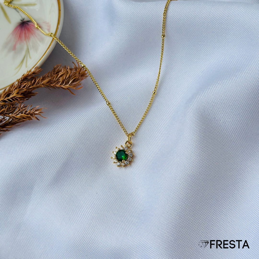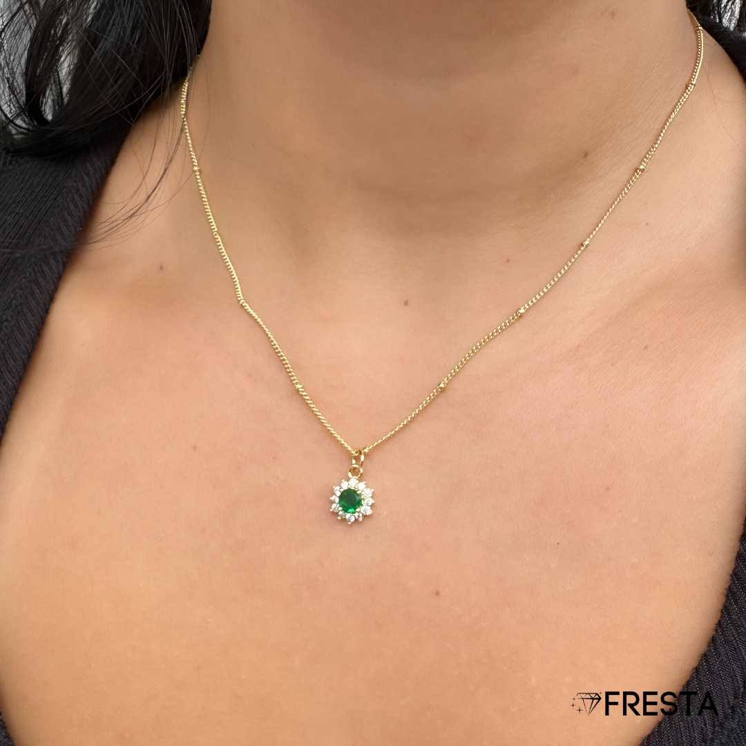 Pequeña en tamaño, poderosa en brillo. La Radiant Halo deslumbra con su piedra central en verde intenso rodeada de un halo sutil de destellos. Ideal para quienes prefieren piezas más delicadas sin renunciar al impacto. Un toque de elegancia compacta para elevar cualquier look, de día o de noche.