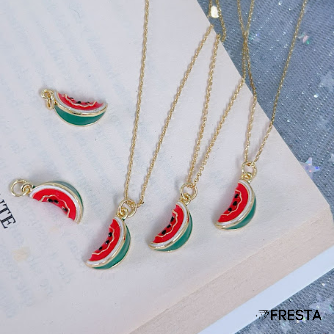 Una explosión de color y alegría para tu cuello. Su dije de sandía combina lo dulce del verano con el brillo dorado que tanto amamos ☀️✨. Llévala sola o combínala con otras piezas para crear un look tan único y refrescante como tú. ¡Ideal para quienes no temen destacar con estilo! 💫🍉